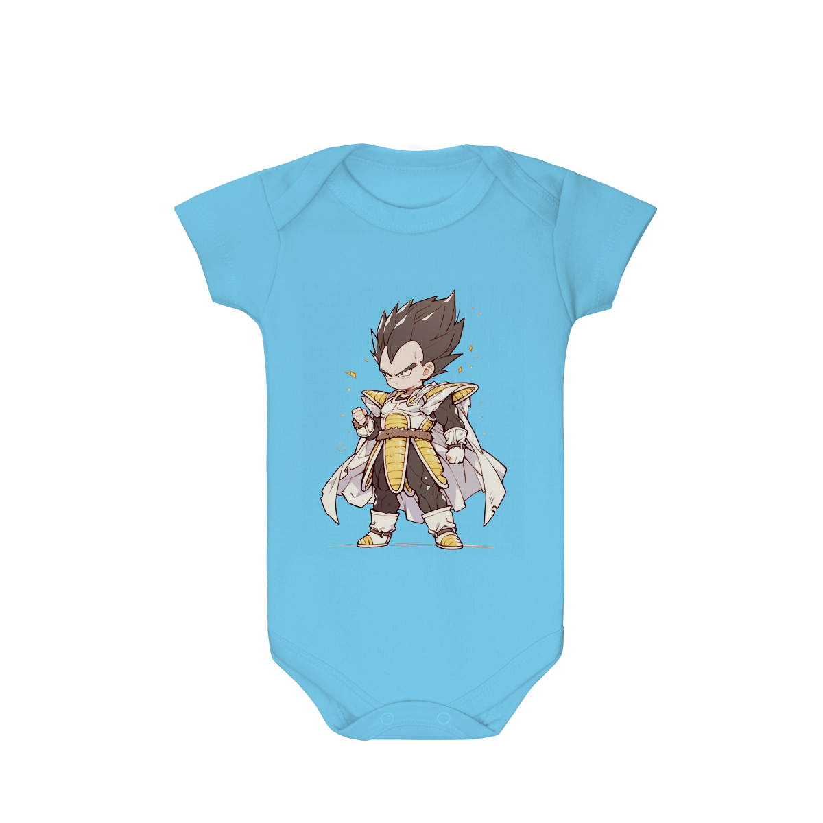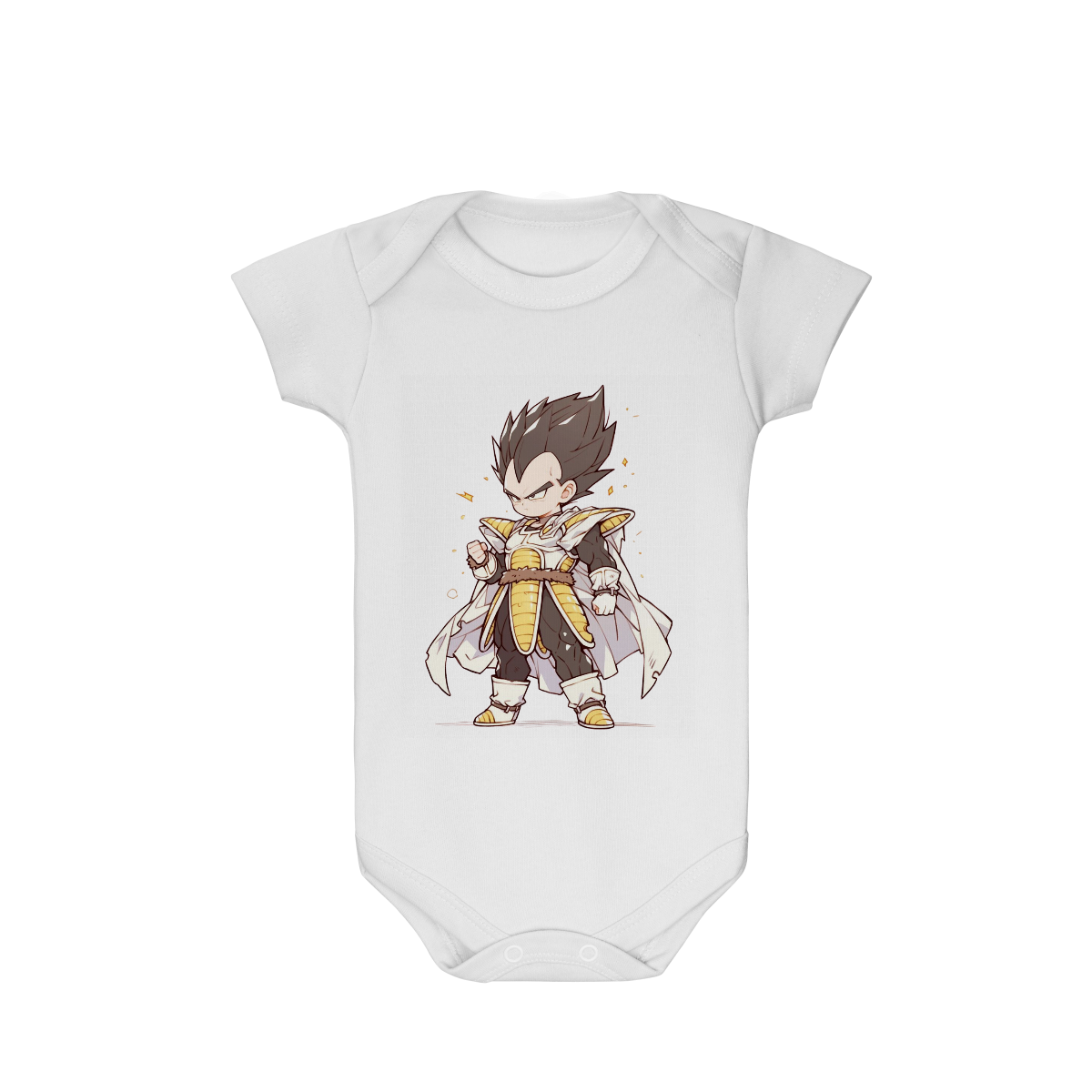 Para os pequenos príncipes Saiyajins! Esta estampa traz Vegeta com sua armadura clássica em versão chibi, com detalhes dourados que representam seu poder. Um body com personalidade forte e muito estilo!